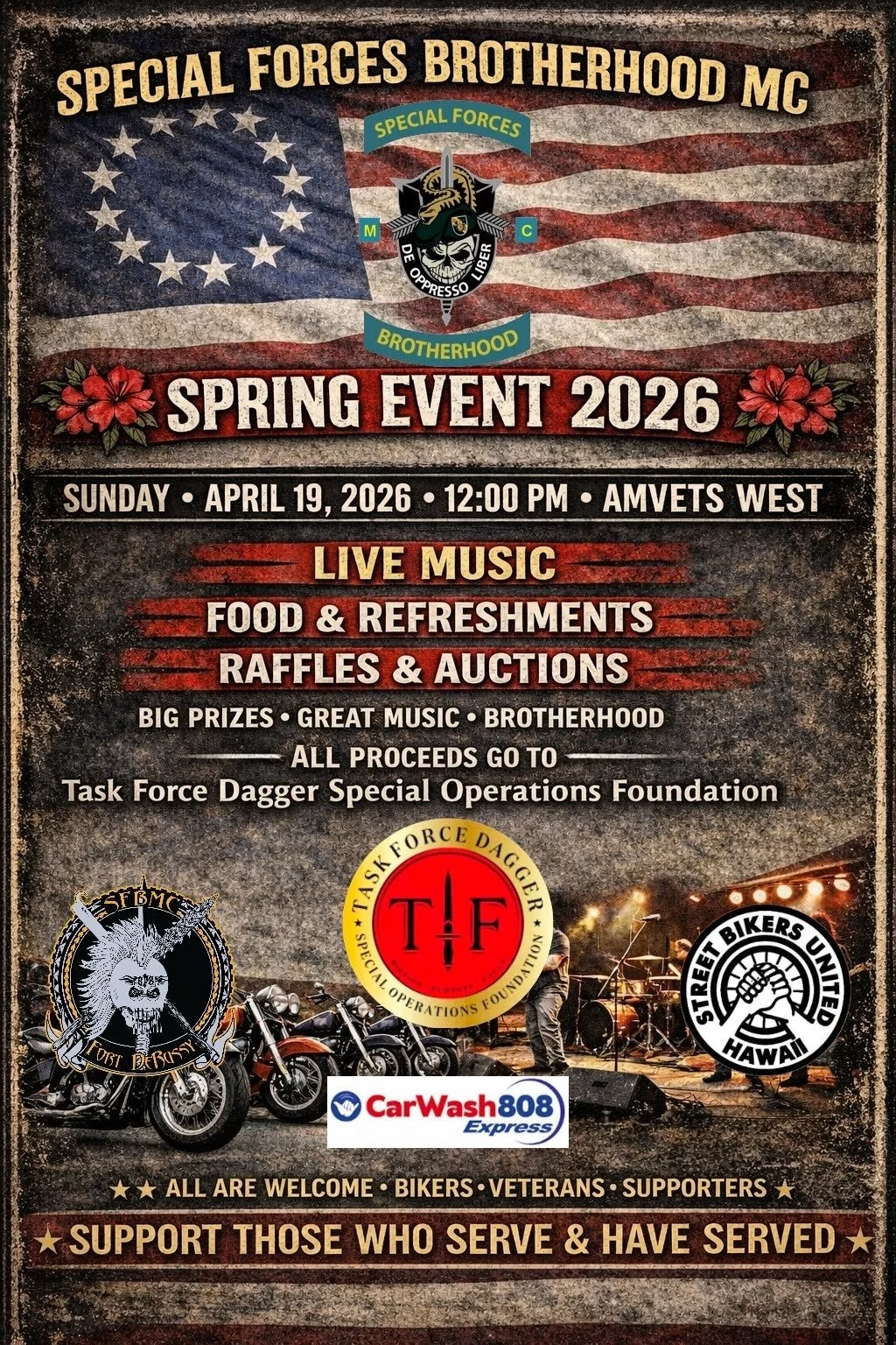 We’ve donated to organizations like: Green Beret Foundation, Special Forces Trust, Special Forces Association, Tunnel to Towers, Weekend with Warriors, and local entities like the Pearl Harbor Aviation Museum, and Maui Fires Relief. We are a 501(c)19 organization